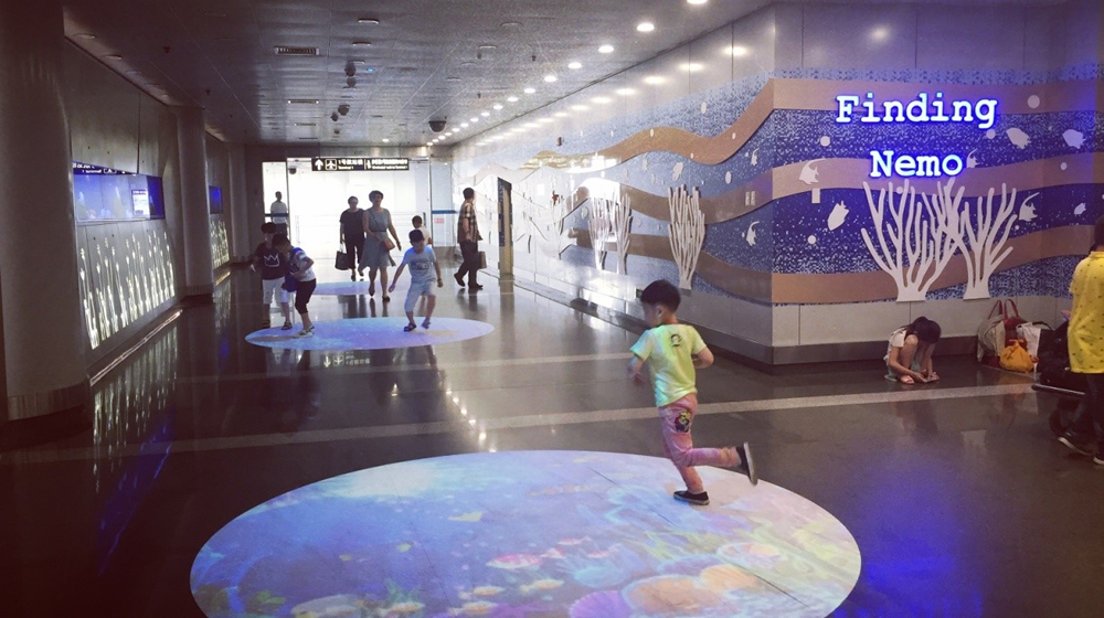 T2連廊口設(shè)置了集“水族觀賞、合影留念、投影互動(dòng)”于一體的T2“海底世界”景觀走廊,新加入的投影互動(dòng)系統(tǒng),將T2“海底世界”的動(dòng)態(tài)影像投影于地面,在紅外系統(tǒng)的監(jiān)控下,旅客腳步踩過“水面”,游魚會(huì)“匆匆”游走,不經(jīng)意間的高科技互動(dòng)體驗(yàn),為旅客帶來了意外的歡樂。